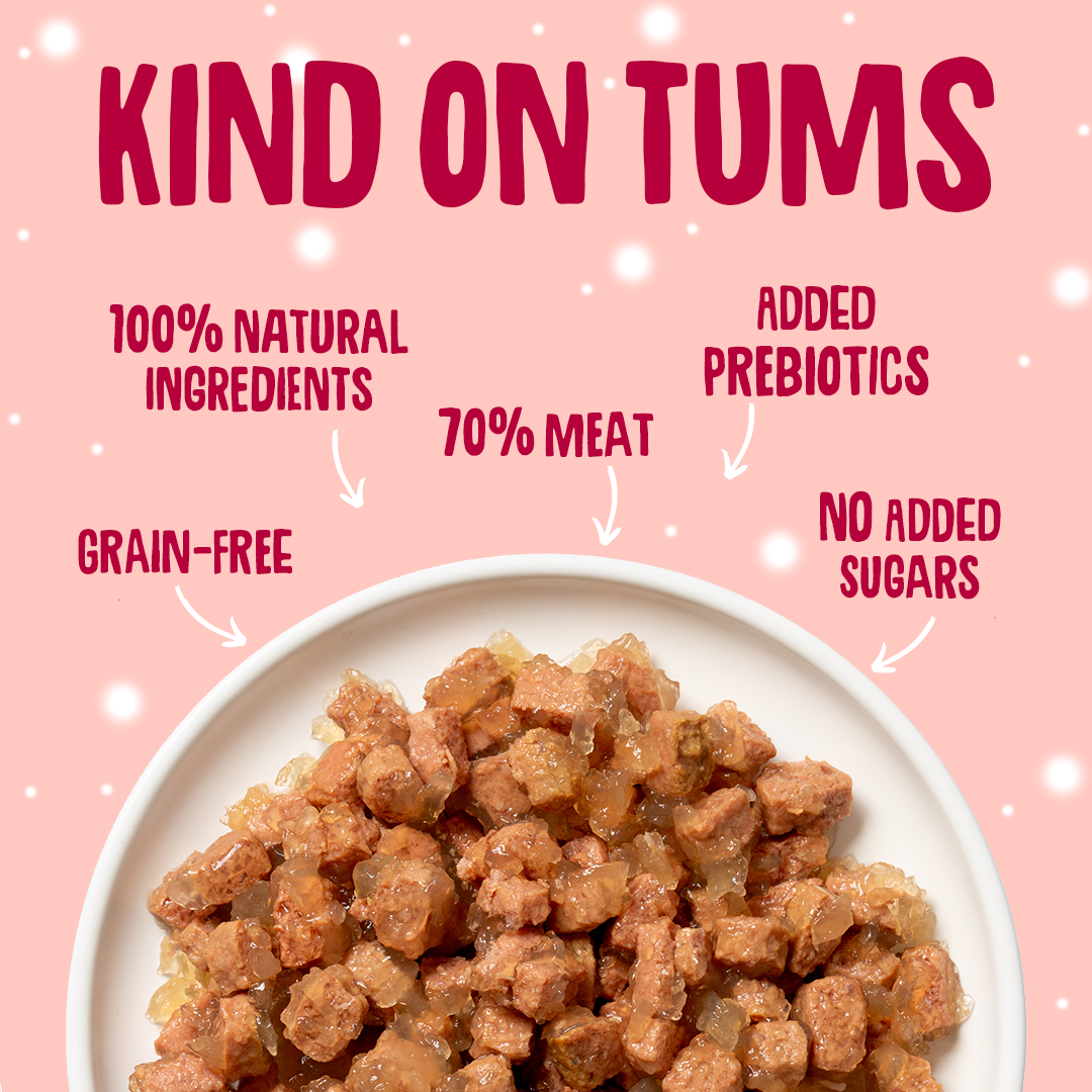 Yes, all our wet food recipes are grain-free and hypoallergenic, meaning we skip common allergens like gluten, dairy, soy, red meat, and egg. Each recipe is packed with natural ingredients, boosted with gut-friendly prebiotics, and avoids added sugar or artificial nonsense. Perfect for sensitive tums and fussy eaters alike.