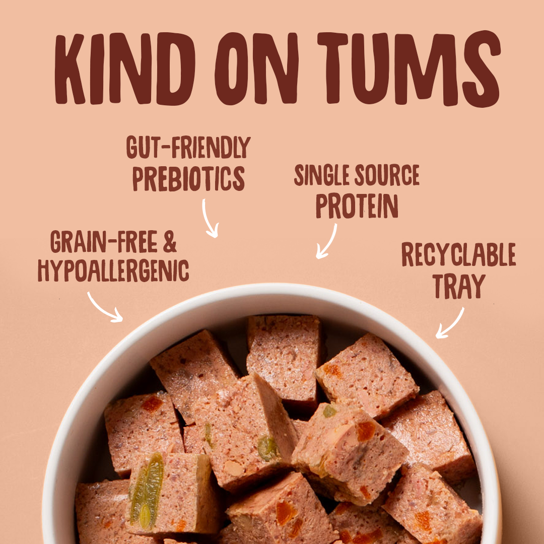 We keep things simple and gentle for tums that need a little extra TLC. Our wet dog food is made with natural, limited ingredients and absolutely no added sugar, salt, or artificial nonsense. Every recipe is boosted with gut-friendly prebiotics to support healthy digestion and help reduce unpleasant poos. It’s also free from common allergens like gluten, dairy, soy, and egg, and every recipe has a single-source of protein, making it a top choice for dogs with food sensitivities or fussy appetites.