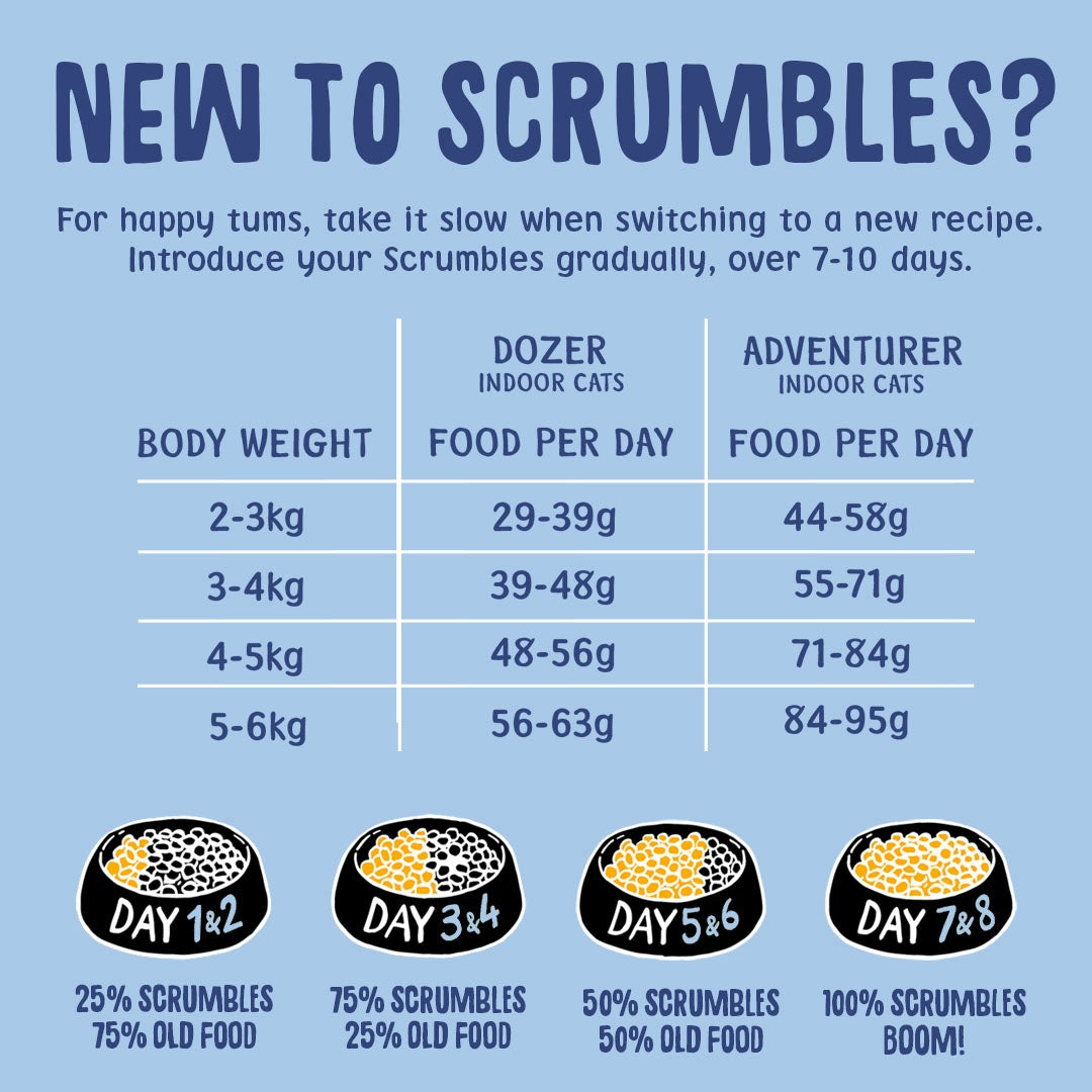 This is a complete meal for cats. Please refer to our product page feeding calculator for a guide on how much to feed your cat, based on their specific needs. Keep in a cool dry place and don't forget to reseal between meals. Made on a site which handles grains.