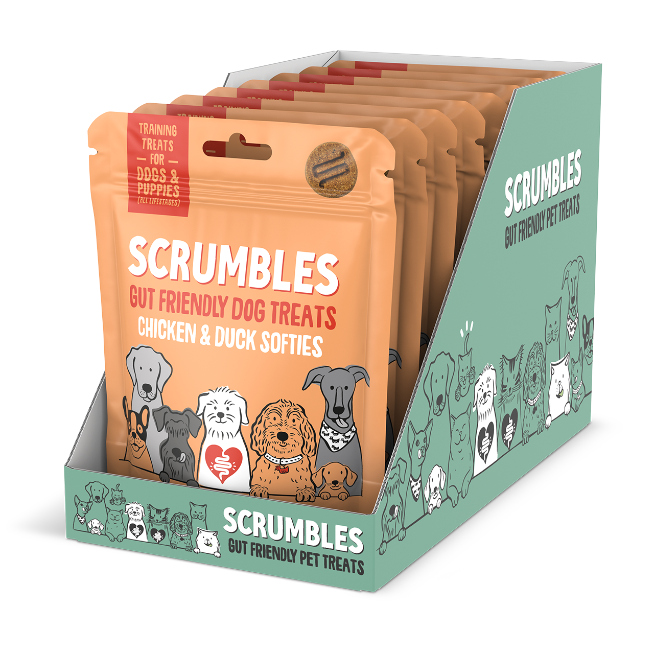 Sit, spin, Softies! These are the ultimutt guilt-free training dog treats for the goodest boys and girls around. Packed full of chicken and duck to ensure your pooch obeys your every command, they're also baked to a soft bite for easy eating on the go. Enriched with extra goodies like prebiotics, pumpkin and chia seeds to support healthy muscles, skin and a glossy coat. Suitable for all dogs from 8 weeks+, we recommend serving 4-5 training treats per day to support a healthy diet, and adjust main meals accordingly.